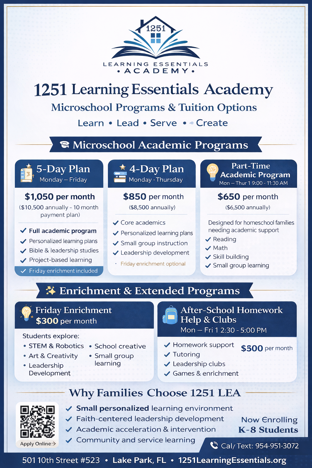 Don't miss the chance to join 1251 Learning Essentials, where personalized education meets innovative learning. Florida families may qualify for scholarships that could make enrollment completely free! Complete your application now to give your child the opportunity to thrive in a supportive, tailored learning environment.